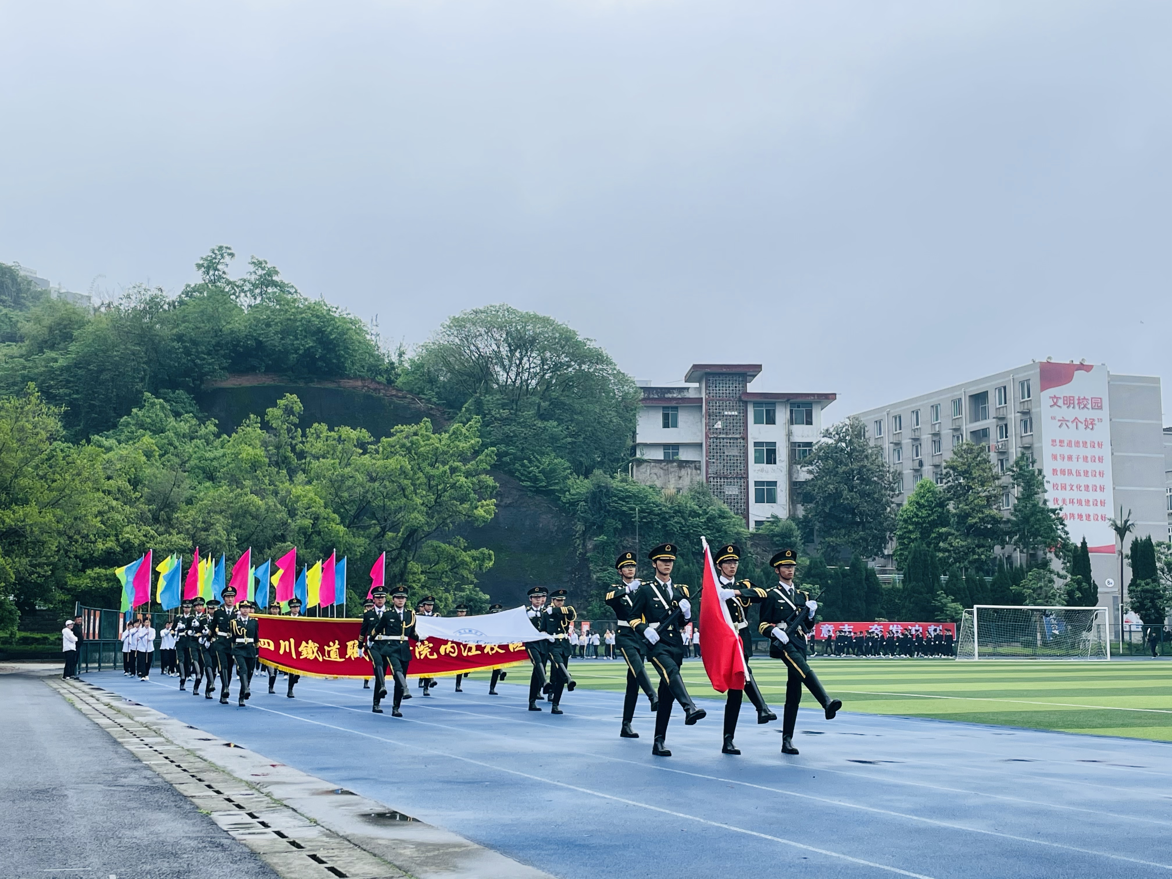 在高亢雄壮的《运动员进行曲》,开幕式正式拉开帷幕。国旗、校旗方队精神抖擞,威仪又庄重,迈着铿锵有力的步伐率先向主席台走来。随后,彩旗方队、教职工方队、各班级方队阵依次向主席台走过,他们步伐沉稳、昂首挺胸、精神饱满、口号铿锵,充分展现出了川铁学子青春活力朝气蓬勃的精神面貌。