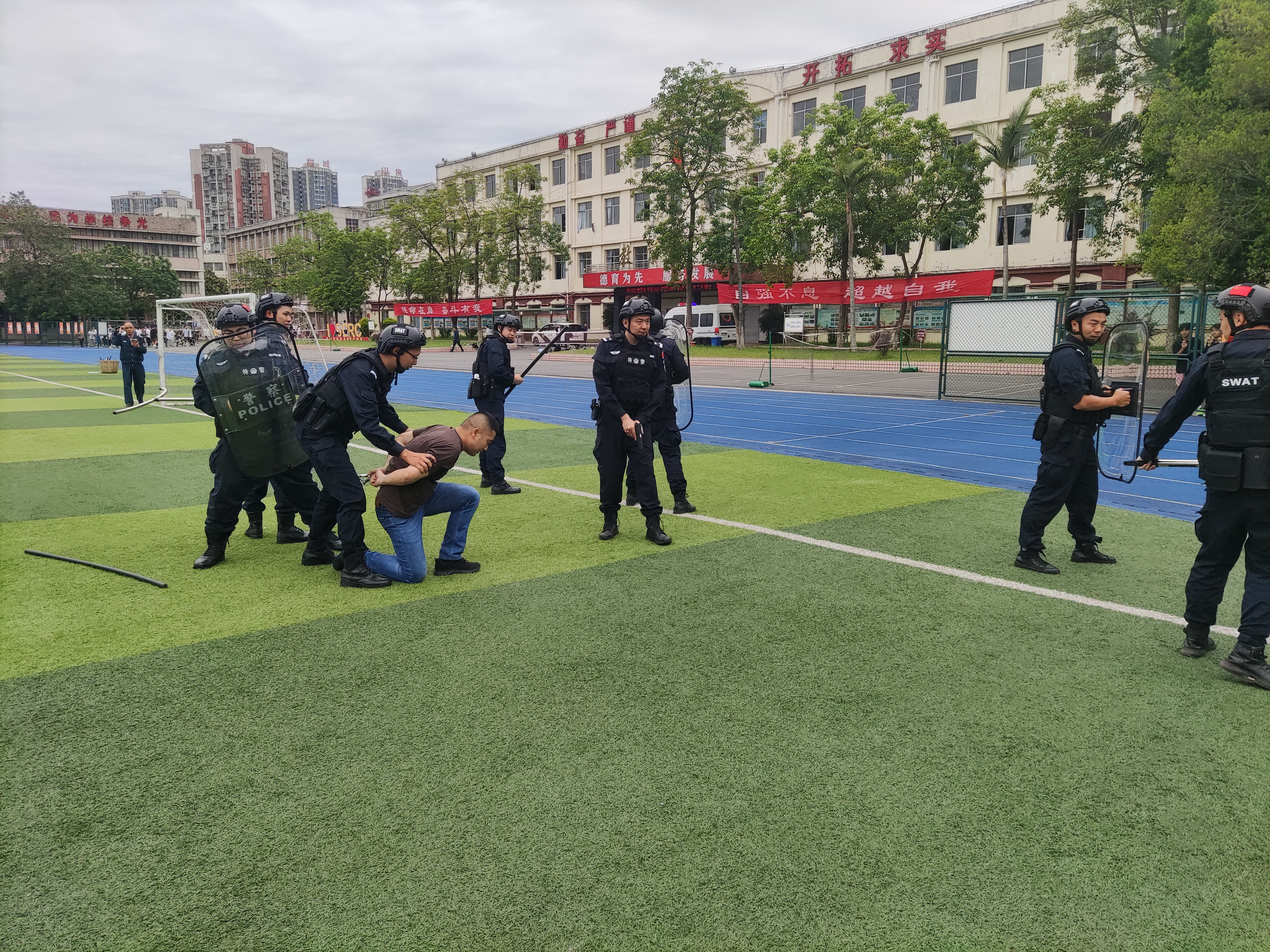 “纸上得来终觉浅,绝知此事要躬行。”在培训结束后,内江校区立即组织了一场实战反恐防暴演练。演练中,模拟了恐怖分子闯入校园,并在足球场砍伤1名学生,师生们迅速启动应急预案,按照预案要求,展开了一系列紧急应对措施。安保人员迅速反应,使用一键报警器报警并通知值班人员。值班人员迅速组织防暴队员手持防暴器材追逐“暴徒”,学生们在老师的引导下,有序撤离到安全区域,随即特警到场制服并控制歹徒;医疗救护人员及时对受伤学生进行救治。整个演练过程紧张有序、有条不紊,充分展示了师生们应对突发事件的快速反应能力和团队协作能力。