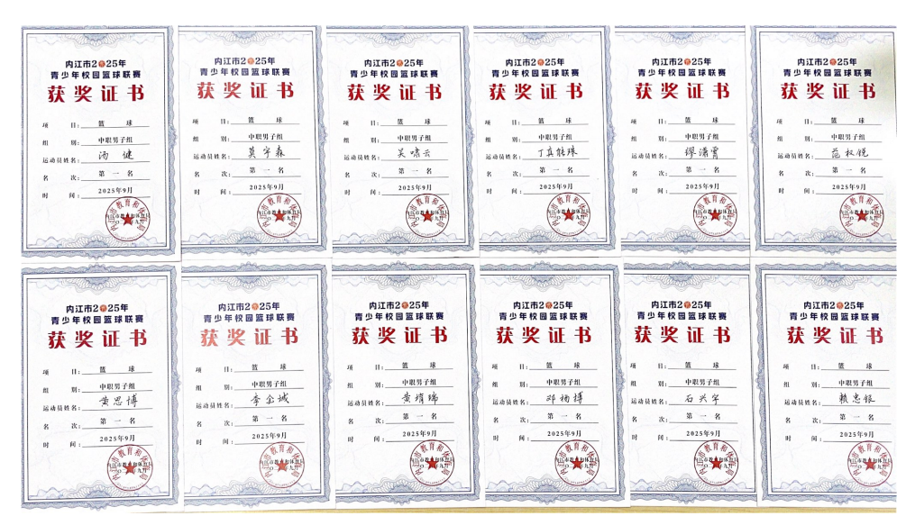 9月26日至29日,内江市2025年青少年校园篮球联赛在内江梅家山体育馆圆满落下帷幕,内江校区男子篮球队在比赛中凭借优秀的团队表现和顽强的竞技作风,夺得联赛中职组冠军。
