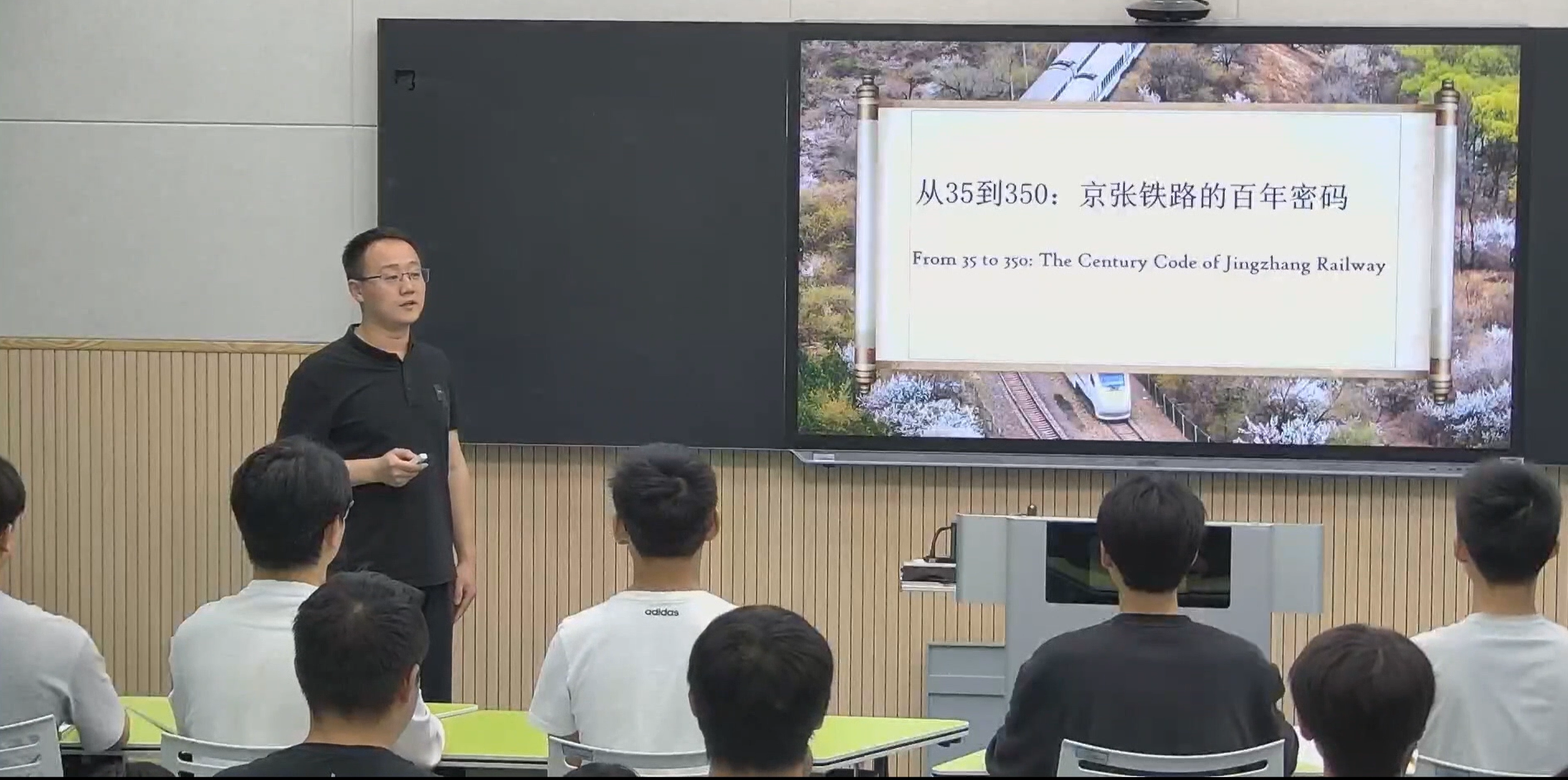 杨镜老师的参赛作品 《从35到350:京张铁路的百年密码》以京张铁路的百年变迁为脉络,用“速度之变”见证“精神之恒”,通过精心设计的双语解说与沉浸式视听体验,引领学生穿越百年时光,不仅生动再现了詹天佑主持修建京张铁路时展现的爱国精神、创新意识、担当品格和工匠精神,更深刻揭示了中国铁路从35公里到350公里跨越背后的精神基因,将詹天佑精神的传承与新时代交通强国建设紧密相连,激发了川铁学子的使命担当,激励他们自觉传承先辈精神,在新时代铁路事业中续写辉煌。
