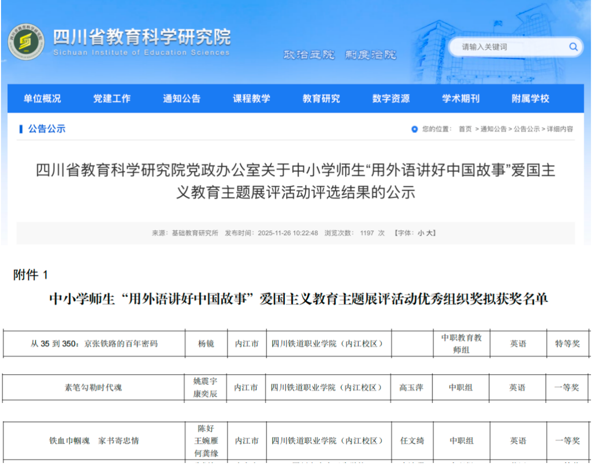 近日,四川省教育科学研究院发布了2025年中小学师生“用外语讲好中国故事”爱国主义教育主题展评活动的评选结果,内江校区教师杨镜荣获中职教师组特等奖,高玉萍和任文绮两位教师指导的学生团队分别获中职学生组一等奖。