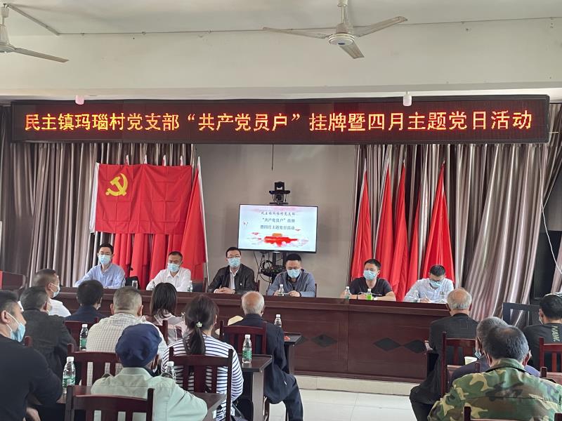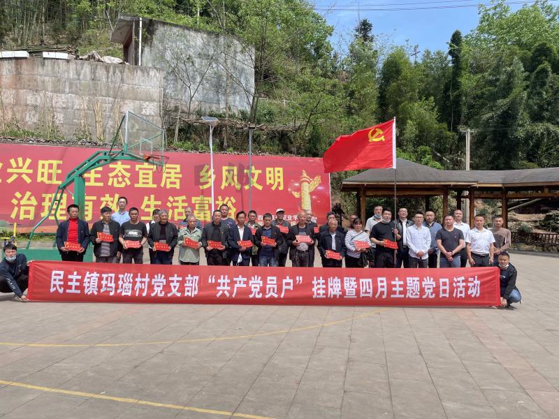 为展现基层党员干部的责任担当,主动亮身份、树形象、做表率,带头参与村级建设和事业发展,充分发挥共产党员的先锋模范作用,进一步推动学校乡村振兴定点帮扶工作。2022年4月21日下午,学校驻村工作队组织玛瑙村党支部全体党员和村组干部在马边县民主镇便民服务中心二楼会议室隆重开展“共产党员户”挂牌暨四月主题党日活动。
