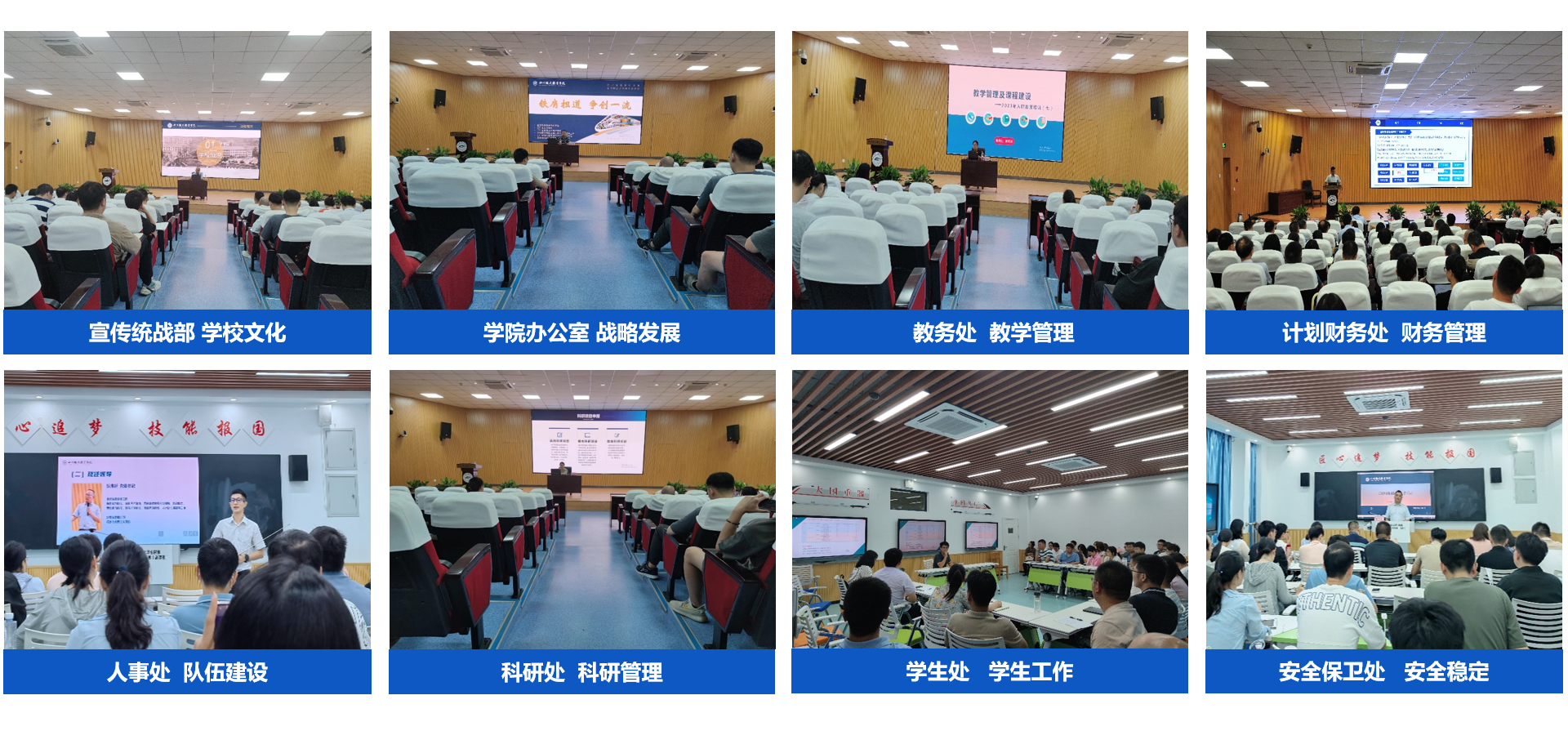 党委宣传统战部从学校的办学历史、发展历程、办学特色、办学成果等多个方面进行了详细介绍。学院办公室结合学校第一次党代会报告,对学校“十四五”总体目标、总体思路和发展战略进行了深入阐述。教务处向新入职教师介绍了学校的人才培养模式及专业学科建设,重点对教学管理规章制度进行了详细解读,并对新入职教师进行了教学发展指导。人事处、计划财务处、科研处、学生处、安全保卫处等职能部门亦从自身业务出发,围绕队伍建设、财务管理、人事管理、薪酬激励、科研项目管理、学生工作及安全稳定等工作的政策法规和规章制度方面为新教师进行了系统、全面的讲解、示疑。