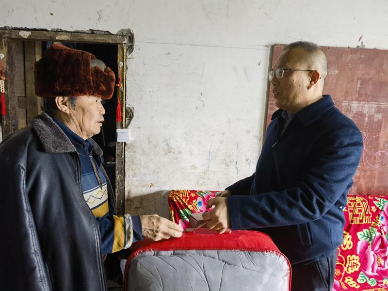 下午,贺兆轩一行来到学校定点帮扶地马边县民主镇玛瑙村,看望慰问学校下派驻村干部李本强、林洪生,详细了解他们在村的工作、生活情况和存在的困难,关心他们的身体健康。随后,深入农户家中开展“走基层、送温暖”活动。在群众家中,贺兆轩与他们亲切交谈,深入了解他们的生产生活条件和教育医疗条件,并向玛瑙村老党员代表、困难群众送去冬被、暖手宝、春联等暖冬慰问品,祝福他们新年快乐,生活幸福。