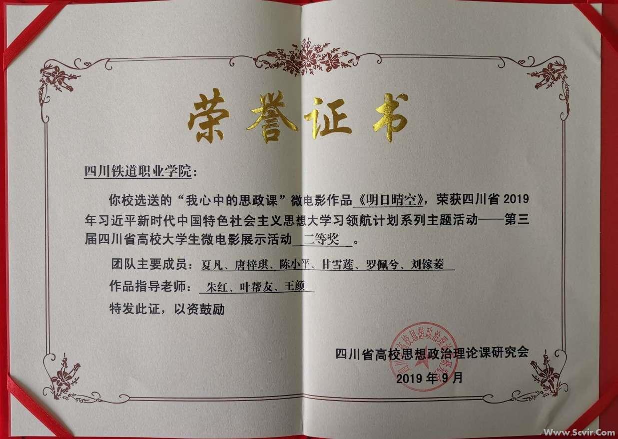 近日,由思政部主任朱红、叶帮友老师、王颜老师(外聘)指导的管理系学生夏凡团队创作的“我心中的思政课”微电影作品《明日晴空》,荣获四川省2019年习近平新时代中国特色社会主义思想大学习领航计划系列主题活动——第三届四川省高校大学生微电影展示活动二等奖。