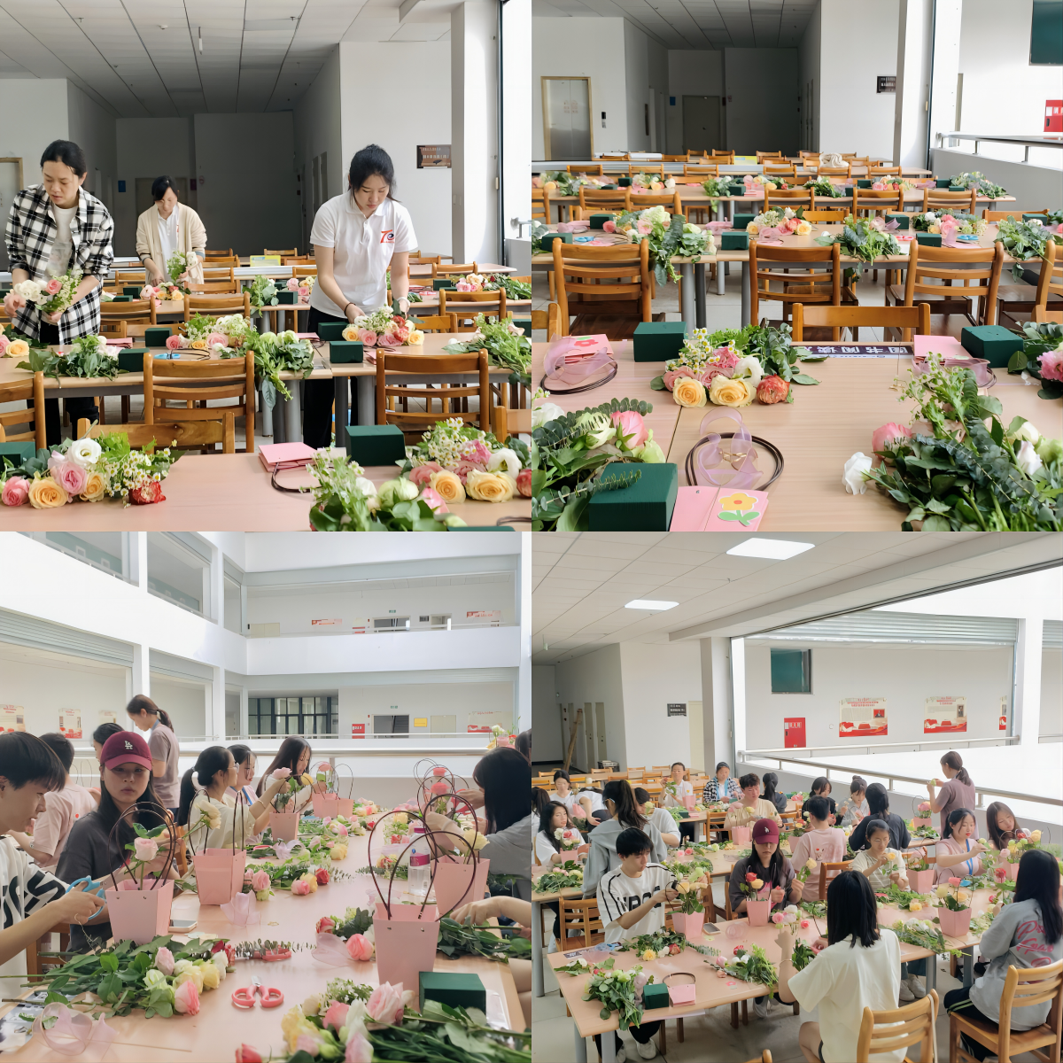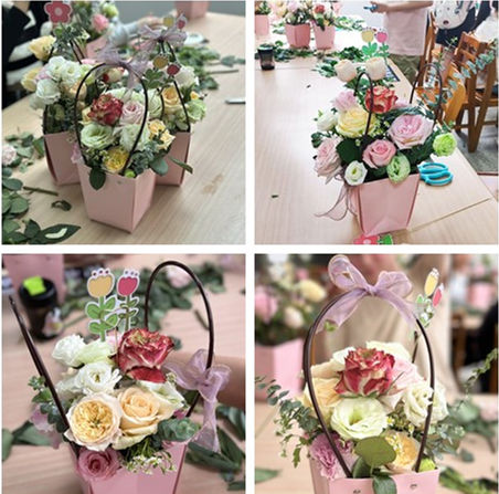 活动现场,桑涛老师讲解了插花技巧以及在操作过程中的注意事项。花香四溢,欢声笑语不断,大家在插花的过程中,不仅感受到了鲜花的美丽与艺术的魅力,还增进了彼此之间的交流与合作。师生们充分发挥想像力和创造力,将形色各异的鲜花巧妙搭配,呈现出一个个精美的花艺作品。