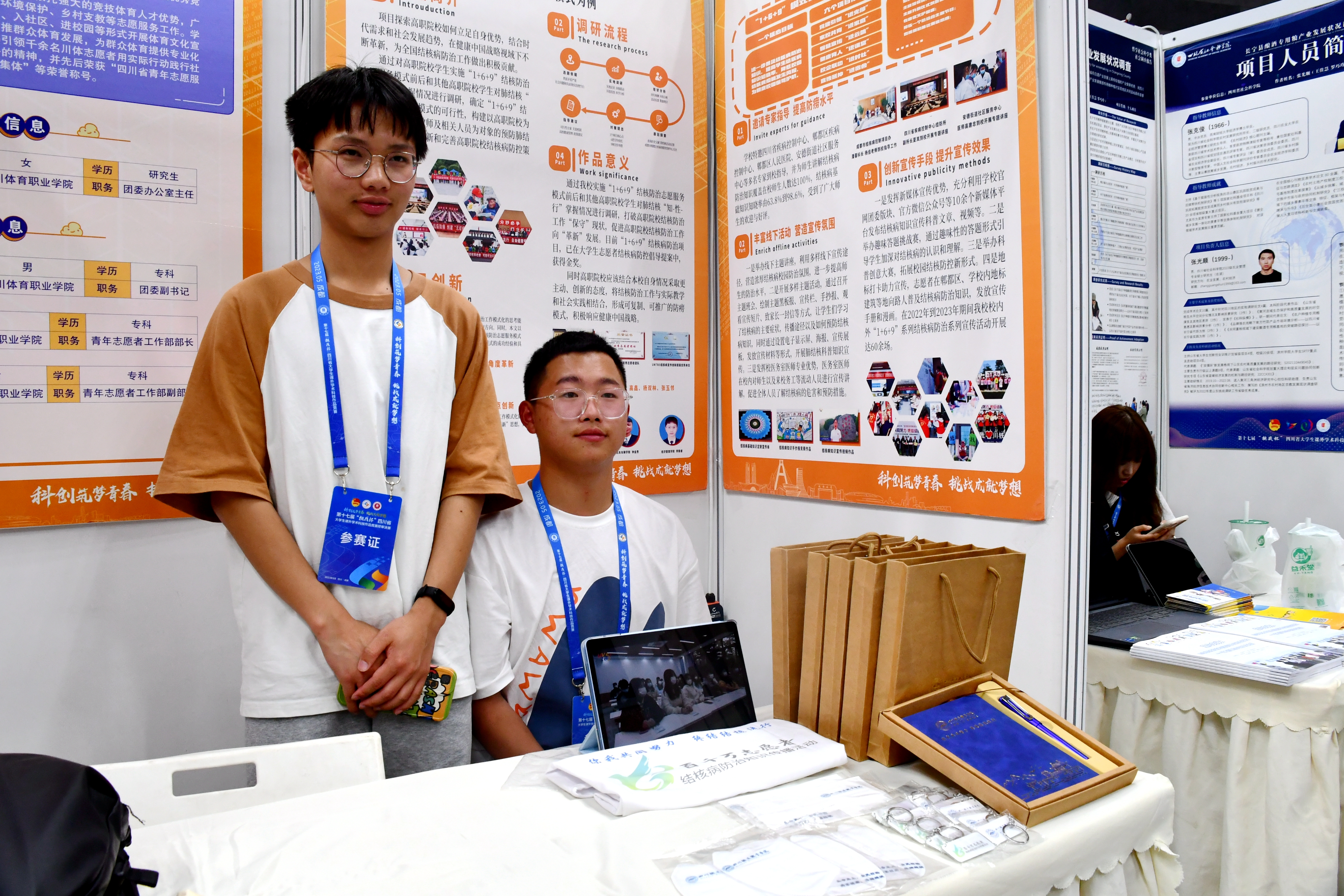 伟德国际钟金焘、李鑫、李陈睿等同学的团队作品《从“一”到“众”健康中国视域下高职院校结核防治 从“保守”到“革新”的调研--以1+6+9防治模式为例设计》进入本次“挑战杯”终审决赛。由团委书记朱俐老师领队,学生处唐恬老师、辅导员刘小杨老师共同带队前往成都大学进行现场路演与展示。整个项目展演期间,该作品备受瞩目,以1+6+9防治结核志愿服务为案例,将结核防治工作与实际教学和社会实践相结合,形成可复制、可推广的模式,受到了诸多高校老师、同学的咨询与探讨,也受到了评委专家的驻足常看和兴趣。