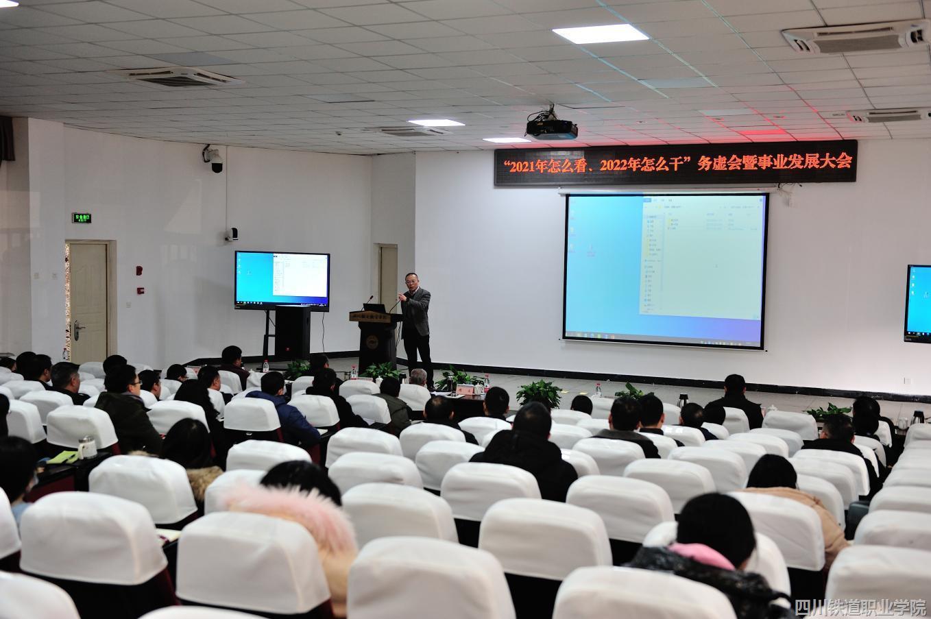 12月24日,学校召开“2021年怎么看、2022年怎么干”务虚会及事业发展大会,党委书记贺兆轩、校长周立以及副校长刘昊君、吴斌、易刚、黄勇出席会议,大会由刘昊君副校长主持。 贺兆轩以“稳中求进 主动作为 推动学校事业高质量发展”为题讲话,指出过去一年学校事业发展“成绩很多、问题不少、未来可期”。讲话从“守牢了一个阵地、打赢了三大战役、推动了系列改革、经受了一些考验、明确了一个愿景——对标双高建设本科”等六个方面总结了学校在贯彻落实党中央决策部署、统筹推进事业发展中取得的主要成绩。同时指出党建引领事业发展还需要进一步加强,干部的创新精神、担当精神和攻坚克难精神一定程度缺乏,高水平人才缺乏、高层次成果较少,基础设施薄弱以及创收收入低等五个方面的突出问题,提出了下一阶段学校的发展思路和重点任务。