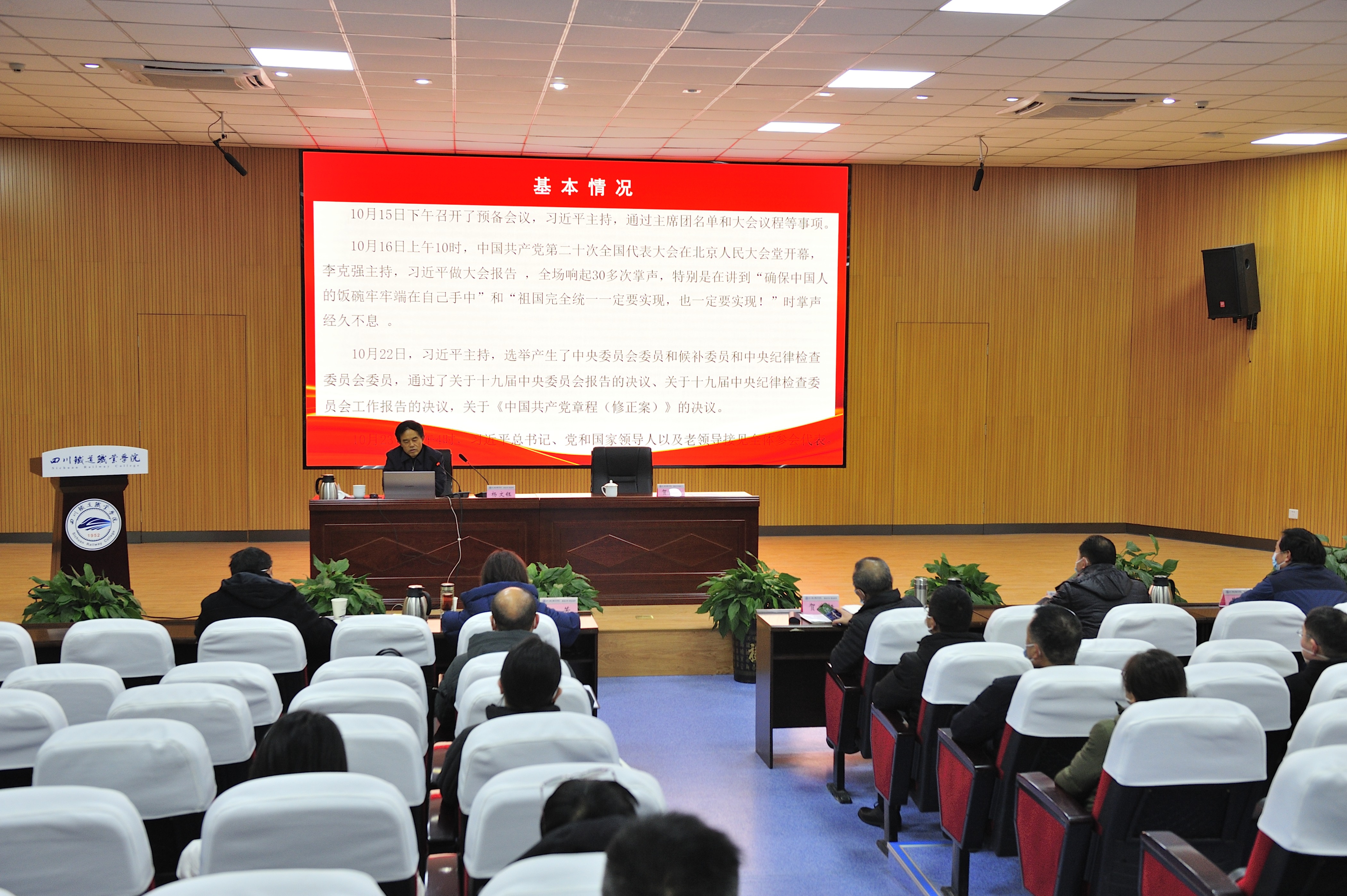 贺兆轩主持会议并指出,杨文钰教授的辅导报告既有政治高度和理论深度,又富有人文精神和家国情怀。报告以小见大,通过一些小切口、小花絮和小故事,讲明了党的二十大召开的重大意义,阐释了职业教育的发展要求,为全校师生上了一堂生动鲜活的专题党课,对全校师生学习贯彻党的二十大精神具有重要启发和指导作用。 贺兆轩强调,全校上下要以此次宣讲为契机,持续兴起学习宣传贯彻党的二十大精神的热潮,常学常新、常思常悟、不断深化;要把思想和行动统一到二十大精神上来,立足国家重大战略部署,紧抓职业教育重大发展机遇,切实把二十大精神贯彻落实到学校改革发展的各项事业中,以永不懈怠的精神状态和一往无前的奋斗姿态,为建成轨道交通鲜明、国内一流高职院校而团结奋斗。