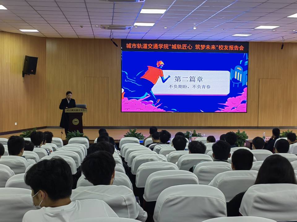 韶光流转,盛事如约。2022年11月8日,即学校建校70周年校庆周的第二天,城市轨道交通学院开展了“奋进七秩谱华章 芳华与共新征程”系列活动。 上午9时,城市轨道交通学院在学校学术报告厅举办“城轨匠心 筑梦未来”专题校友报告会。2006级校友、成都地铁运营三公司9号线运营中心副主任兰平健,2006级校友、成都地铁控制中心副主任徐磊,2009级校友、成都地铁4号线电客车组长肖芳,2009级校友、成都地铁运营四公司安全管理王荣作为本次校友报告会的嘉宾分别做了报告,与师生们共同分享。