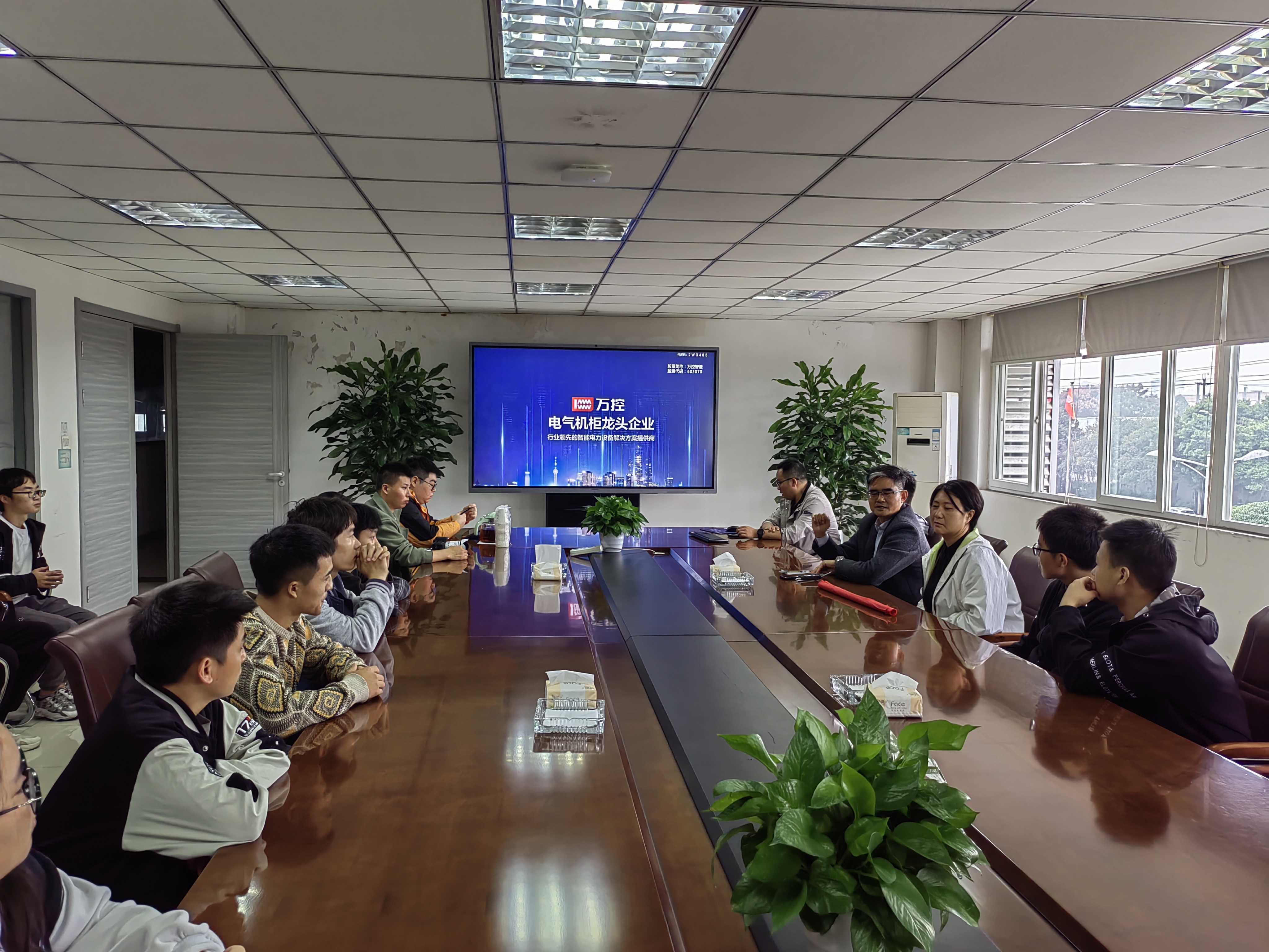 公司人力资源部总监翁长伟热情接待了来访的师生,并通过公司宣传片详细介绍了万控集团有限公司的企业发展、产品研发、岗位职责、考核评价、员工福利等相关情况。
