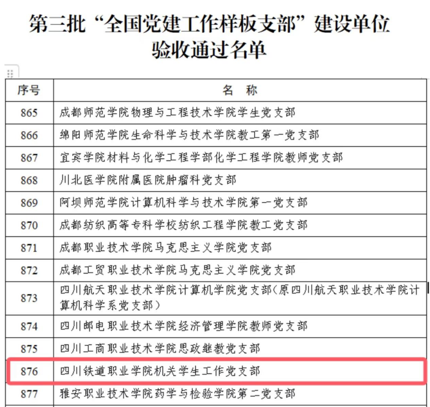 自创建全国样板支部以来,支部获省级及以上荣誉10项、市级13项、校级3项,党员获省级及以上表彰和奖励5项、市级10项、校级8项;其中,“铁肩担道义,五育铸新人”支援铁路春运实践项目获四川省第二批高校思想政治工作精品项目、四川省志愿服务大赛银奖、成都市志愿服务大赛金奖等,“铁肩担道,小川前行”——构建全员参与的“1335”实践育人平台入选四川省第四批思政工作精品项目,“纵身救人”志愿者事迹受到中央电视台、人民网、中青网、中国青年报、全国铁道团委等20余家媒体报道;“铁小川”志愿服务团队被授予“全国铁路青年安全生产示范岗”,支部获“全国无偿献血促进奖特别奖”,实践团队获全国优秀“三下乡”社会实践团队、全国“百千万志愿者结核病防治知识传播活动提升行动”国家级优秀志愿者团队;突破性获得“互联网+”产业赛道国家级铜奖,以及第九届四川省国际“互联网+”大学生创新创业大赛1金1银1铜;把就业工作摆在更加突出位置,深入访企拓岗,强化就业指导,合作单位由26个增至136个,就业岗位由2123个增至4974个,2022年、2023年毕业生就业率分别达到93.16%和95.52%,学校就业工作受到省委、省委教育工委领导肯定。