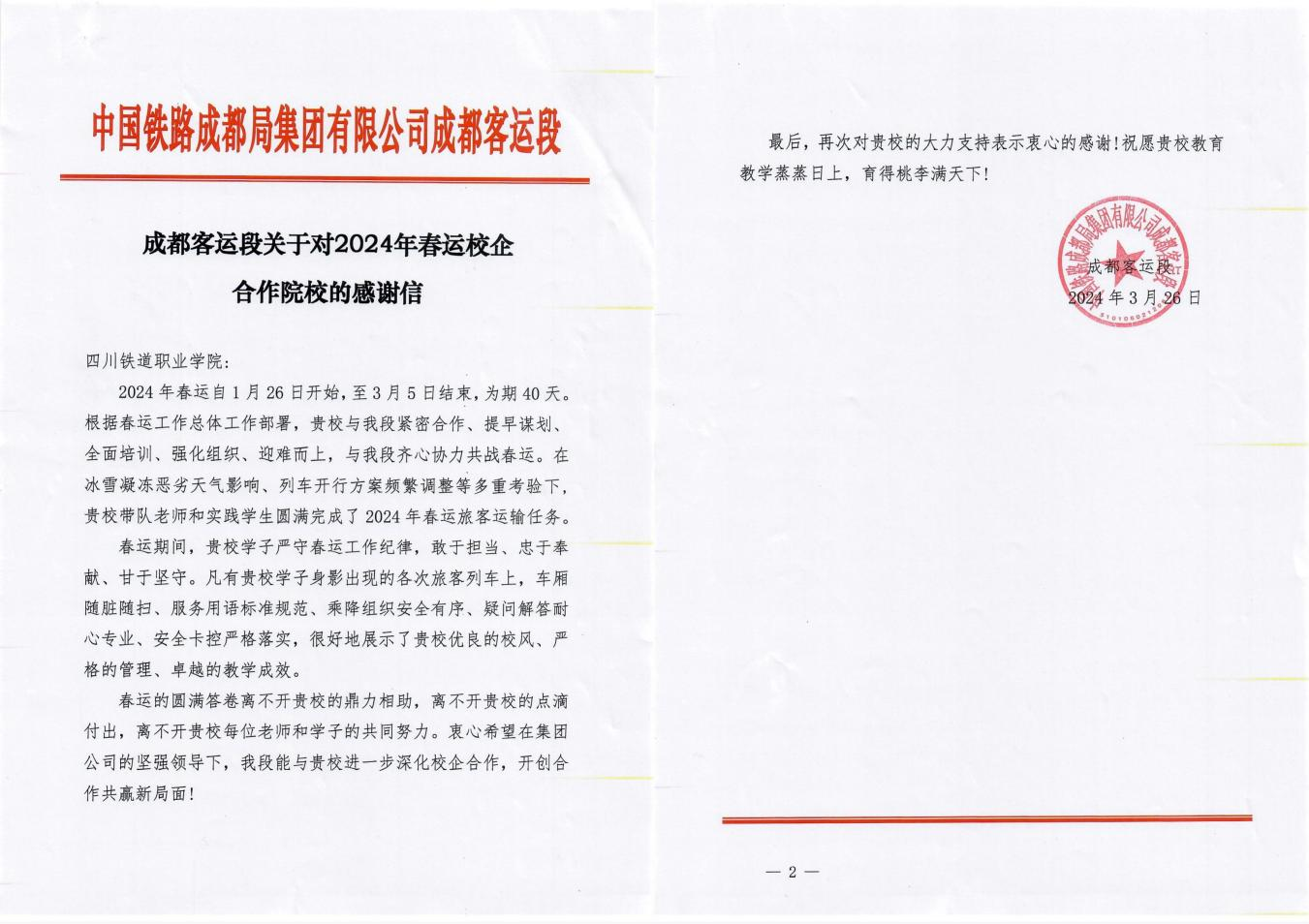 近日,伟德国际收到中国铁路成都局集团有限公司成都客运段感谢信,来信对伟德国际“祖国再大,我也要助您平安回家”春运社会实践暨志愿服务的组织和志愿服务工作给予充分肯定和高度赞扬。信中提到,伟德国际志愿者严守工作纪律,敢于担当、忠于奉献、甘于坚守,凡是有伟德国际志愿者身影出现的各次旅客列车上,车厢随脏随扫、服务用语标准规范、乘降组织安全有序、疑问解答耐心专业、安全卡控严格落实,很好地展示了学校优良的校风、严格的管理、卓越的教学成效。