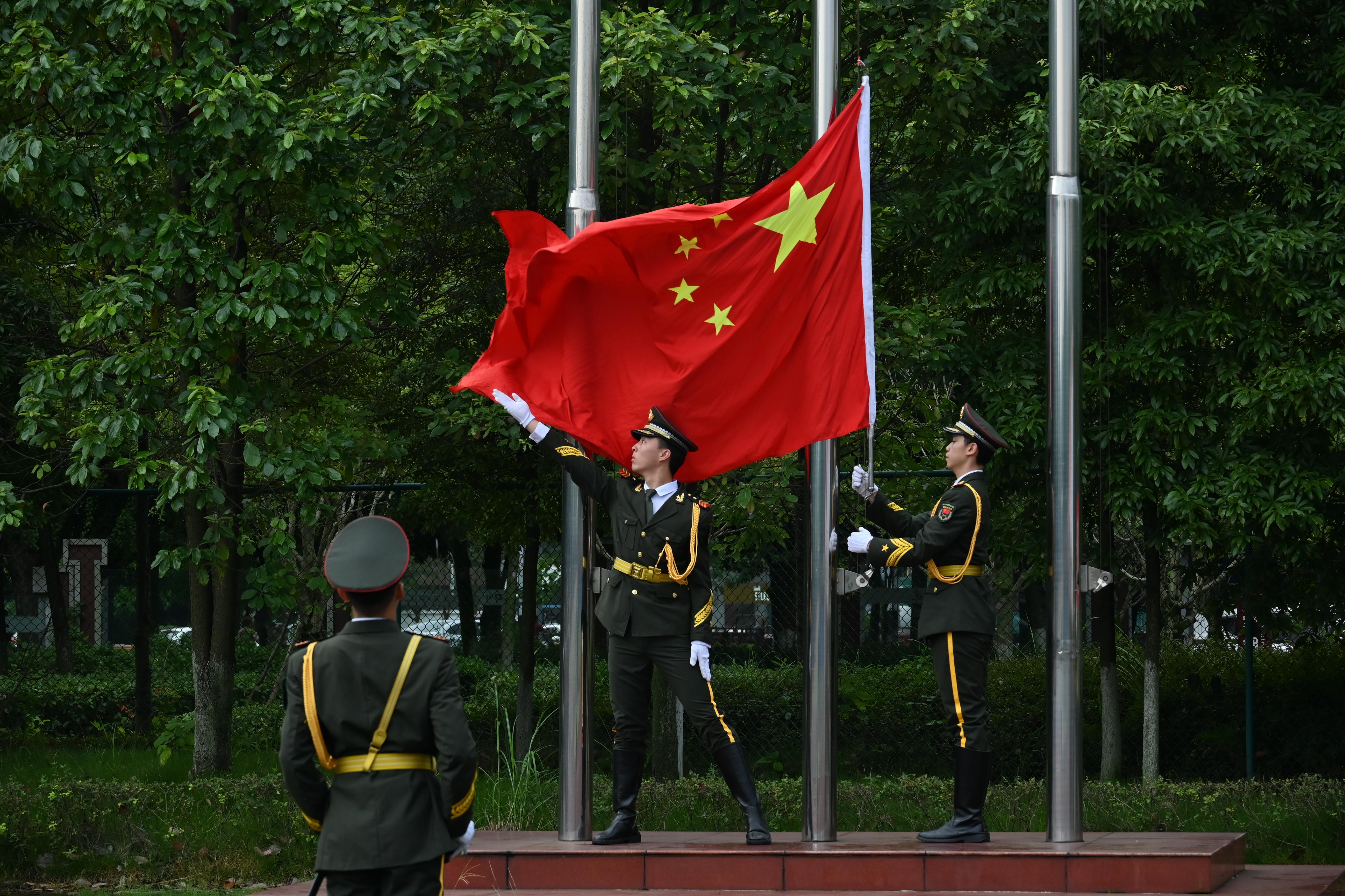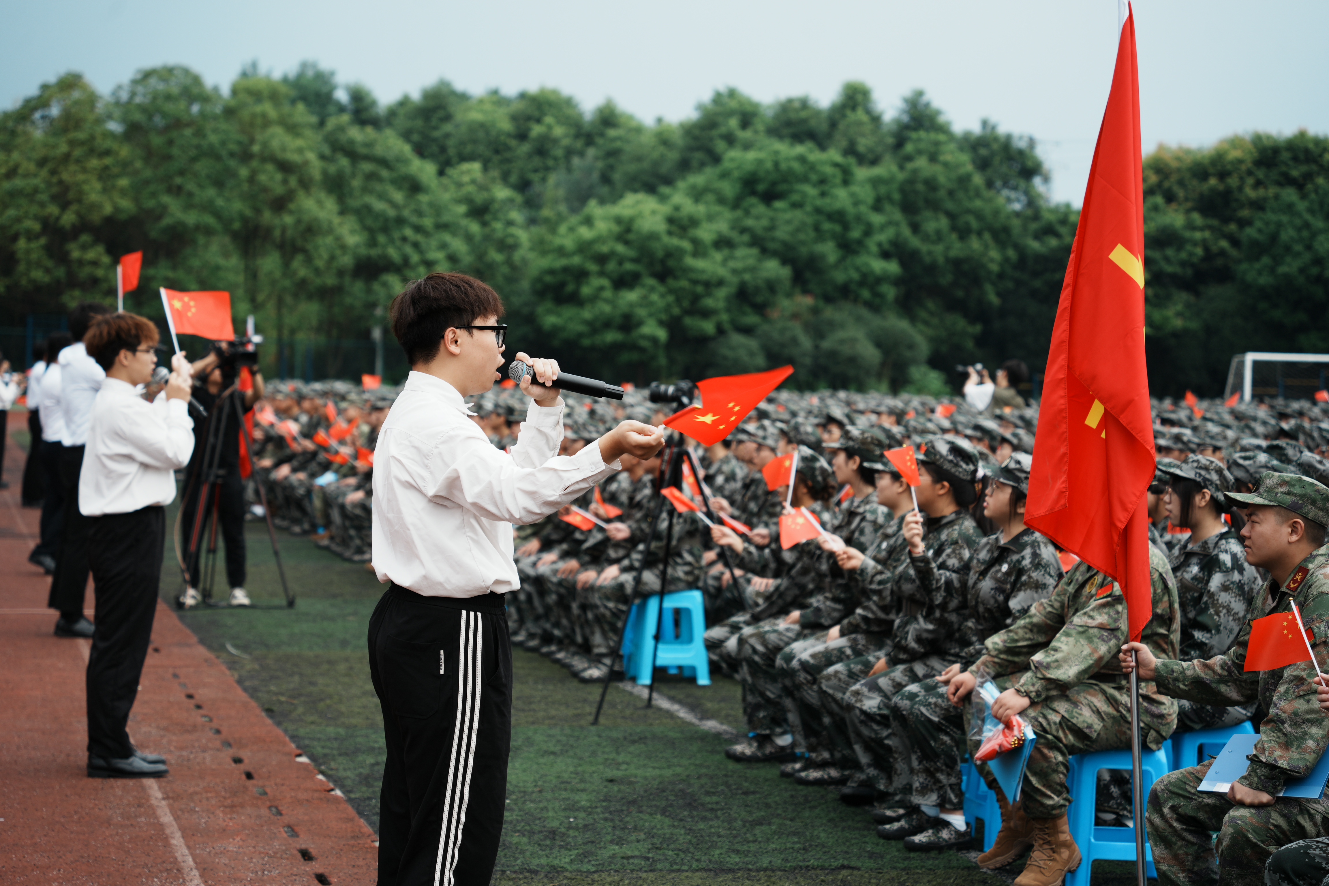 伴随着雄壮的国歌声,五星红旗冉冉升起,新生开学典礼正式拉开序幕。