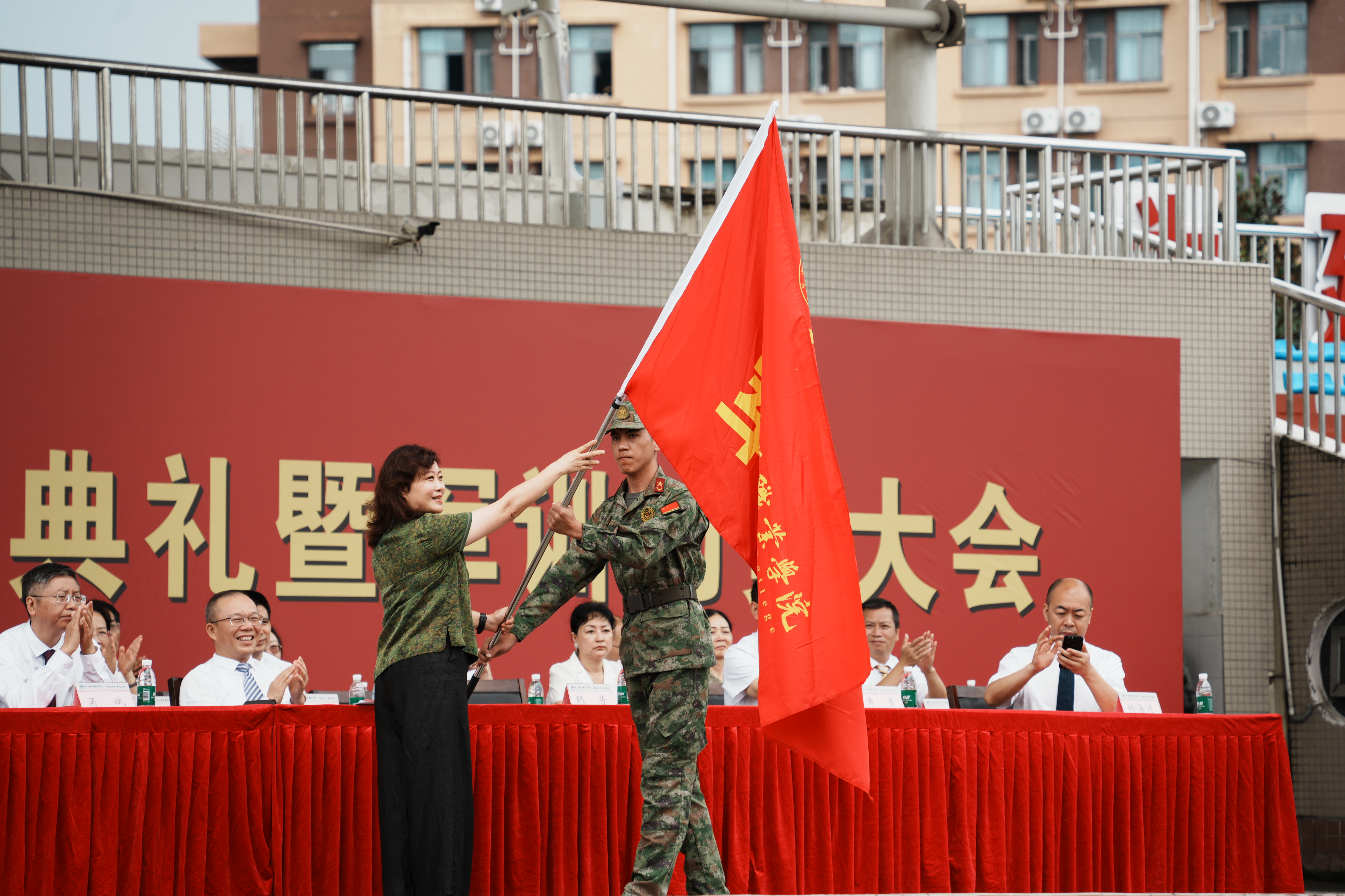 党委委员、副校长黄恩兴宣读2024级新生军训团任命决定。党委副书记、校长赖芳为军训团授旗,党委委员、纪委书记池秋平作军训动员。