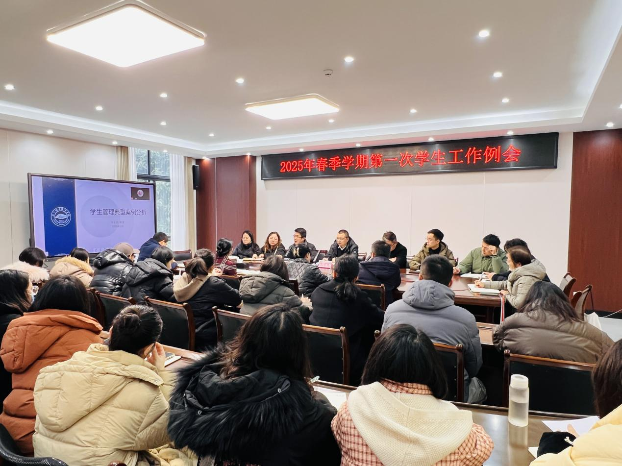 2月24日上午,学校在第三会议室召开2025年春季学期第一次学生工作例会。副校长代学灵出席会议并讲话,各二级学院、内江校区管委会党总支书记,全体专职辅导员及党委学生工作部、团委相关工作人员参加会议。会议由党委学生工作部部长王文杰主持。