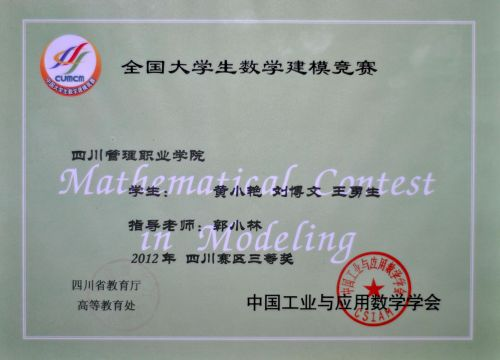 个参赛队同台角逐,我院学子发奋图强、不负众望,在四川赛区表现优秀,其中一队荣获三等奖。通过参加竞赛,可以增加学院和教育厅的联系,更好的贯彻落实教育厅的相关教育精神;可以加强学院和其他高校的联络,多方面提升学院知名度;可以锻炼学生应用数学解决实际问题的能力,极大的提升学生的综合素质。