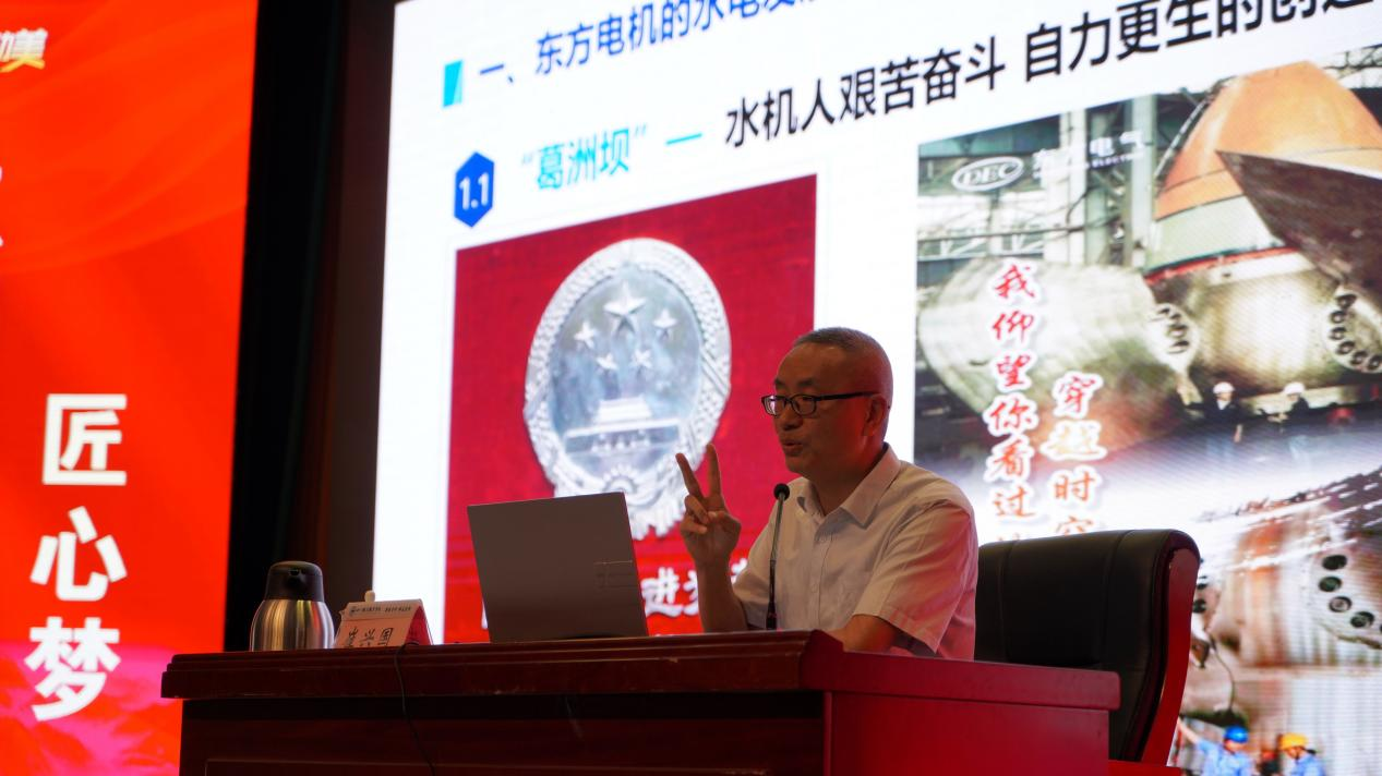 崔兴国在讲座中,结合自己的工作和成长经历,从“东方电机的水电发展历程”“我眼中的工匠”“培养工匠的思路”“践行工匠精神追求卓越品质”“成长感言”五个方面声情并茂地讲述自己爱岗敬业、拼搏奉献的感人故事,鼓励师生要坚定理想信念、勇担时代使命,在实践中打磨一技之长,在点滴间淬炼匠心品质,发扬精益求精、执着专注的工匠精神,走技能成才、技能报国之路。他将一颗颗劳动光荣、技能宝贵、创造伟大的种子播撒在青年学子的心田。