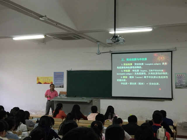 陈教授主讲《食品免疫学》课程,从社会高度关注的食品安全问题开始引入食物过敏问题,介绍了食品过敏的发现和发展历史。陈教授在授课过程中重点讲解了免疫反应,在免疫应答上做了详细的讲解,同时科学解释抗原的定义,纠正同学们平常对抗原的错误理解,介绍了免疫原性,抗原性,抗原簇,异嗜性抗原,完全抗原,半抗原等,以牛乳过敏重点讲解过敏,使同学们充分了解了食品过敏与免疫。最后,陈教授还就转基因作物的潜在致敏性评价进行了分析和介绍,全面深入地讲授了食品免疫学。