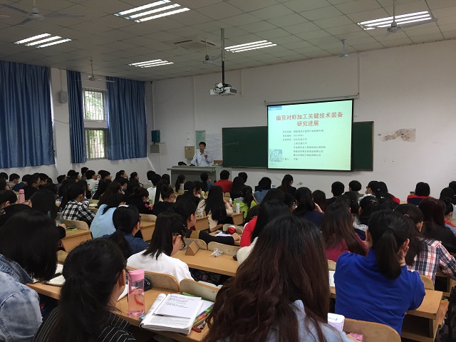在“扇贝对虾加工关键技术装备研究进展”报告中,王教授介绍了ACE酶抑制肽、抗氧化肽、扇贝调味品、扇贝和对虾组织化等食品的开发现状,并讲解了我国海洋贝类加工的研究进展及对虾剥壳设备、扇贝剥壳设备、太阳能干燥设备的研发现状。在“红枣加工进展”报告中,王教授介绍了红枣白兰地、红枣干红、红枣醋的加工进展,并重点介绍了红枣固态发酵法酿造枣酒过程中甲醇的产生机制。王教授以其渊博的知识、平易近人的态度、幽默的授课方式,引起了同学们的极大兴趣,报告过程中,同学们认真聆听,积极做笔记,主动交流。王教授耐心解答了同学们的疑问,赢得了同学们的一致好评。
