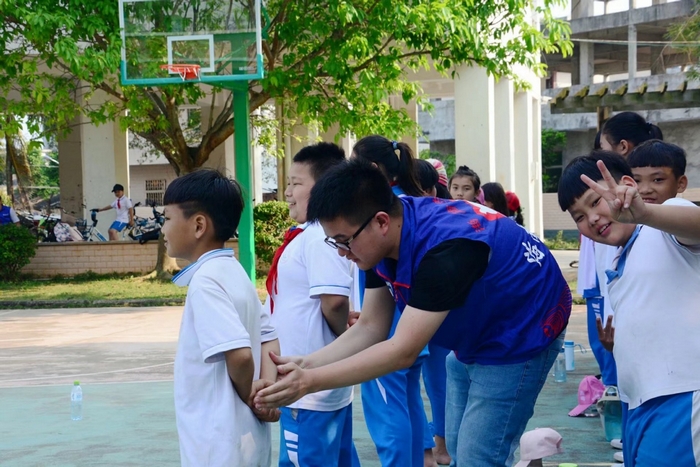 军训活动现场,食品学院、马克思主义学院和人文传播学院的优秀教官先给孩子们讲解军训要求、整理队伍并选出方阵负责人。在教官的指导下,孩子们以饱满的精神状态参与站立军姿、稍息、跨立与立正等训练项目。训练期间,支教教师担当起“辅导员”的角色,时刻关注孩子们的训练效果与身体状况,并在训练的休息时间里教授孩子们唱《打靶归来》、《义勇军进行曲》等经典军歌,普及爱国主义教育。活动吸引了不少学生家长前来观看,看着孩子们在努力训练,他们也对孩子们的表现露出了欣慰的微笑,并对我们的支教团队给予充分肯定。
