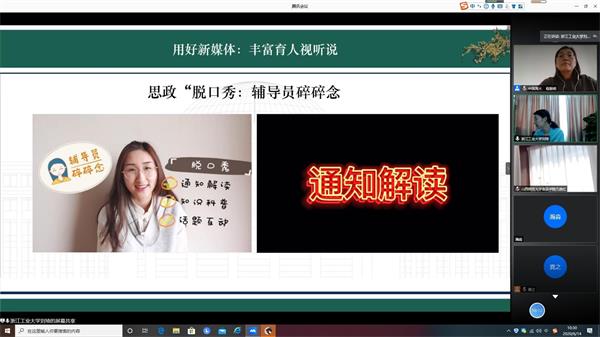 浙江工业大学BB贝博艾弗森原官方网站党委副书记刘琦作《疫情背景下网络育人探索与实践》分享。分享介绍到,学院通过上好专业第一课——育人“食”课,增加专业自信——科普抗“疫”,将思想政治教育与专业学习相结合;同时用好新媒体,通过思政脱口秀——辅导员啐啐念,以图育人——系列海报明信片等形式,丰富育人视听说。