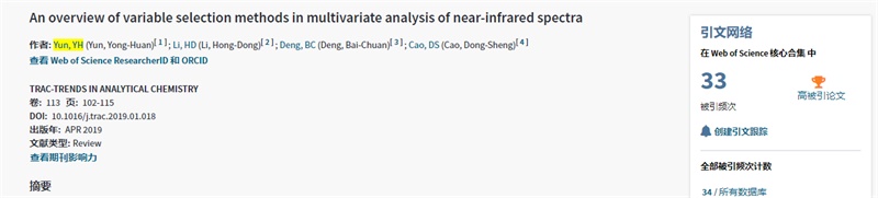 该篇论文题“An overview of variable selection methods in multivariate analysis of near-infrared spectra”,于2019年4月在JCR一区分析化学top期刊《TrAC Trends in Analytical Chemistry》(2020影响因子为9.801)正式发表(https://www.sciencedirect.com/science/article/pii/S0165993618304709)。此篇论文得到国家自然科学基金(21705162)及BB贝博艾弗森原官方网站高层次人才引进科研启动项目(KYQD(ZR)-1844)的资助,这是贝博官网以第一单位发表的第三篇ESI高被引论文,充分证明贝博官网科研实力的不断提升。