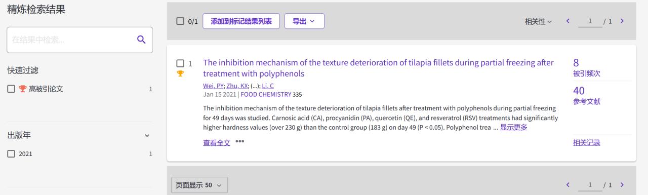 近日,根据ESI公布的最新数据显示,BB贝博艾弗森原官方网站热带水产品加工与贮藏团队李川副教授课题组在农林科学领域Top期刊《Food Chemistry》(影响因子7.514)发表题为 “The inhibition mechanism of the texture deterioration of tilapia fillets during partial freezing after treatment with polyphenols”的研究论文入选全球前1%ESI高被引论文。