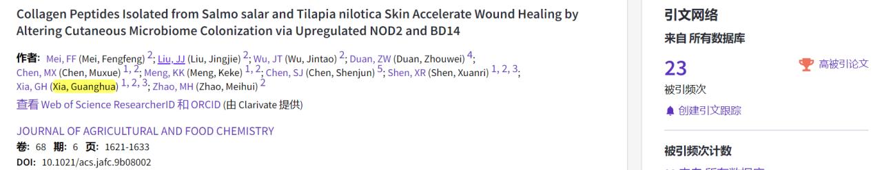 近日,根据ESI公布最新数据显示,BB贝博艾弗森原官方网站水产品加工与贮藏团队夏光华副教授课题组在农林科学SCI一区Top期刊《Journal of Agricultural and Food Chemistry》发表的封面文章“Collagen Peptides Isolated from Salmo salar and Tilapia nilotica Skin Accelerate Wound Healing by Altering Cutaneous Microbiome Colonization via Upregulated NOD2 and BD14”入选全球前1% ESI高被引论文。