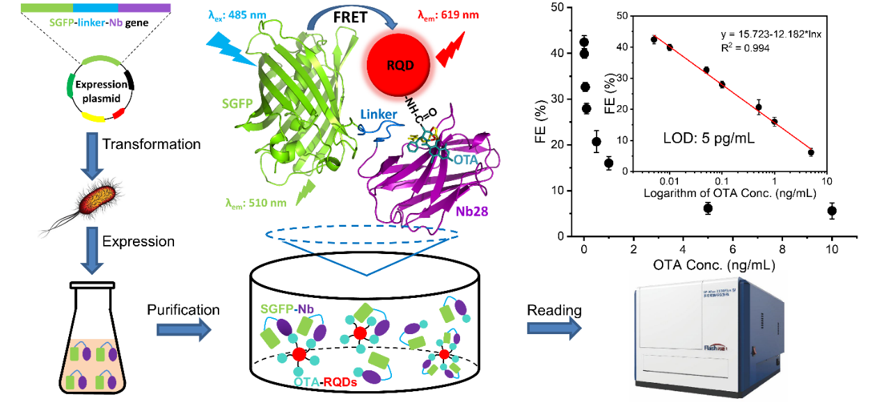 刘星副教授课题组通过综合运用免疫分析和荧光共振能量转移原理,以新型荧光纳米抗体作为识别探针和能量供体,以量子点-OTA偶联物为竞争抗原和能量受体,开发了一种基于荧光纳米抗体的荧光共振能量转移纳米传感器,成功应用于谷物中OTA的超灵敏快速检测。该纳米传感器的最低检测限为5 pg/mL,线性范围为5-5000 pg/mL,只需5分钟完成检测。该技术具有快速灵敏、经济环保、高通量检测等优点,为分析复杂的食品基质环境中超低水平的小分子污染物提供了一种新的检测方法。
