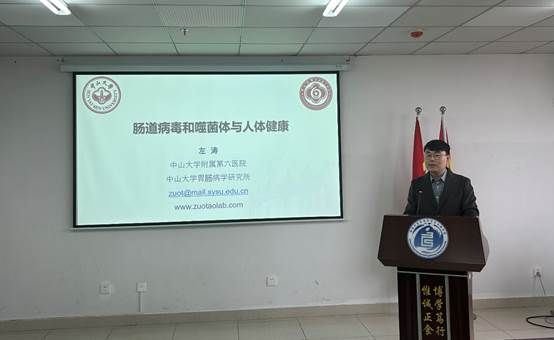 2023年12月27日上午,贝博官网邀请中山大学胃肠病学研究所副所长、国家高层次青年人才左涛研究员在研发楼610会议室作了题为“肠道噬菌体和病毒与人体健康”的学术报告。报告由李川副院长主持,学院邓秀成书记等院领导、部分教师和研究生聆听了报告。