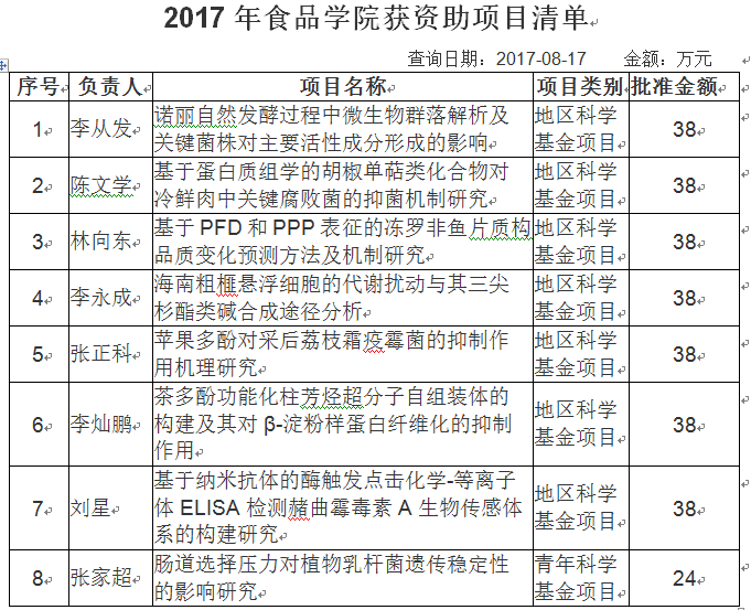 2017年8月17日传来捷报,2017年BB贝博艾弗森原官方网站共有79个项目获得国家自然科学基金资助,其中食品学院有8项,其中地区科学基金项目7项,青年科学基金项目1项。获资助项目情况如下表所示://www.hainanu.edu.cn