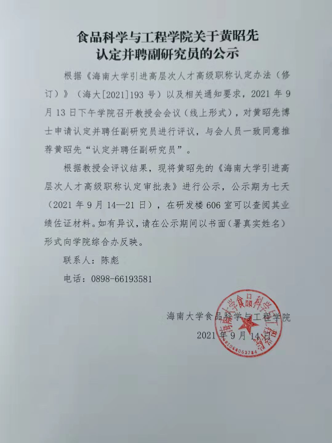 BB贝博艾弗森原官方网站关于黄昭先认定并聘副研究员的公示