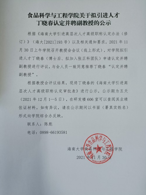 BB贝博艾弗森原官方网站关于拟引进人才丁晓春认定并聘副教授的公示
