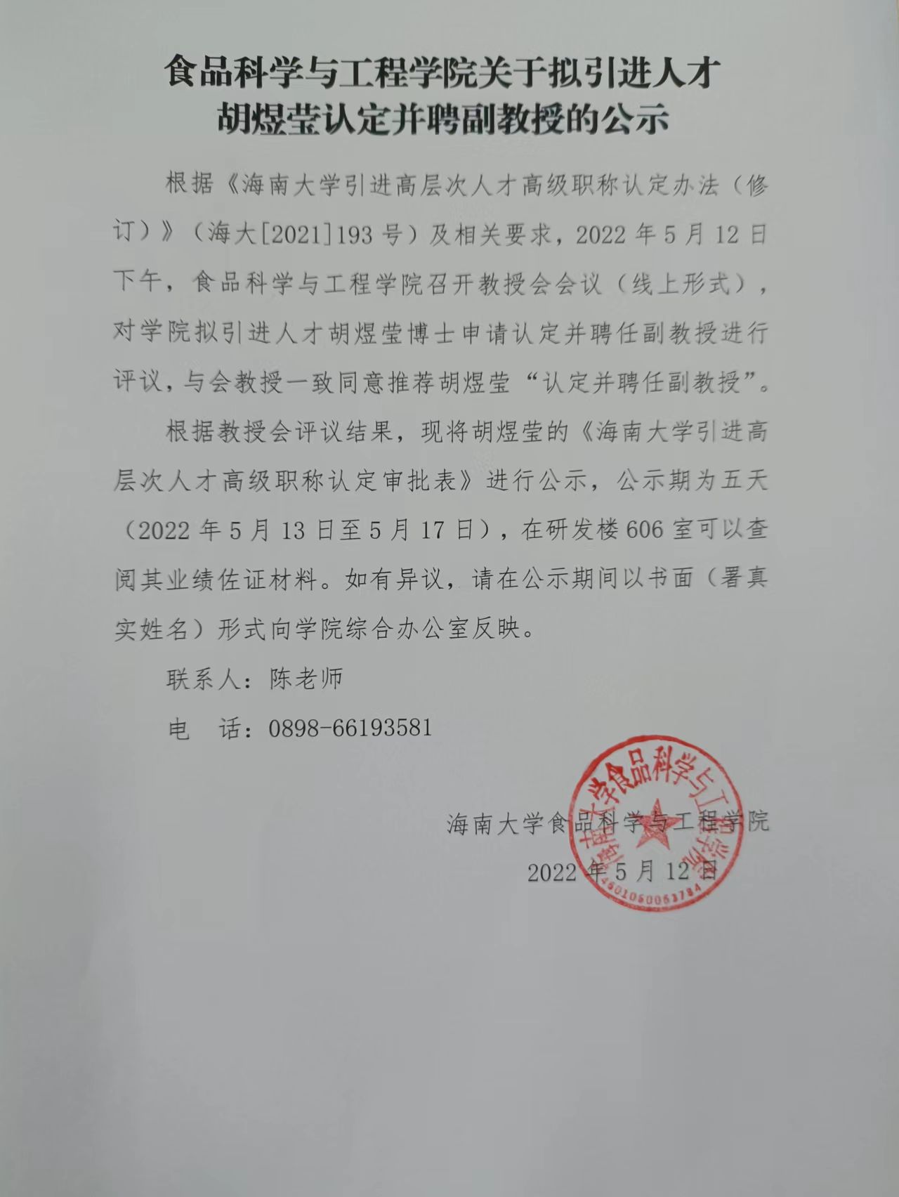 BB贝博艾弗森原官方网站关于拟引进人才胡煜莹认定并聘副教授的公示
