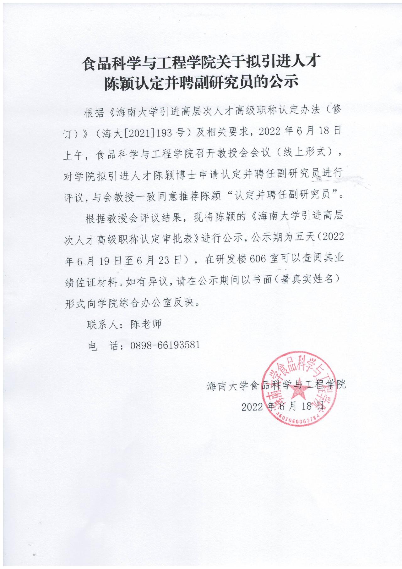 BB贝博艾弗森原官方网站关于拟引进人才陈颖认定并聘副研究员的公示