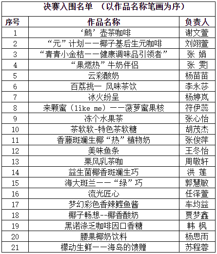 根据《BB贝博艾弗森原官方网站第一届“热作杯”食品创新大赛方案》要求,经个人申报、资格审查、专家评委逐一评选,现将入围决赛的作品名单进行公示,公示时间2023年9月25日至9月30日。